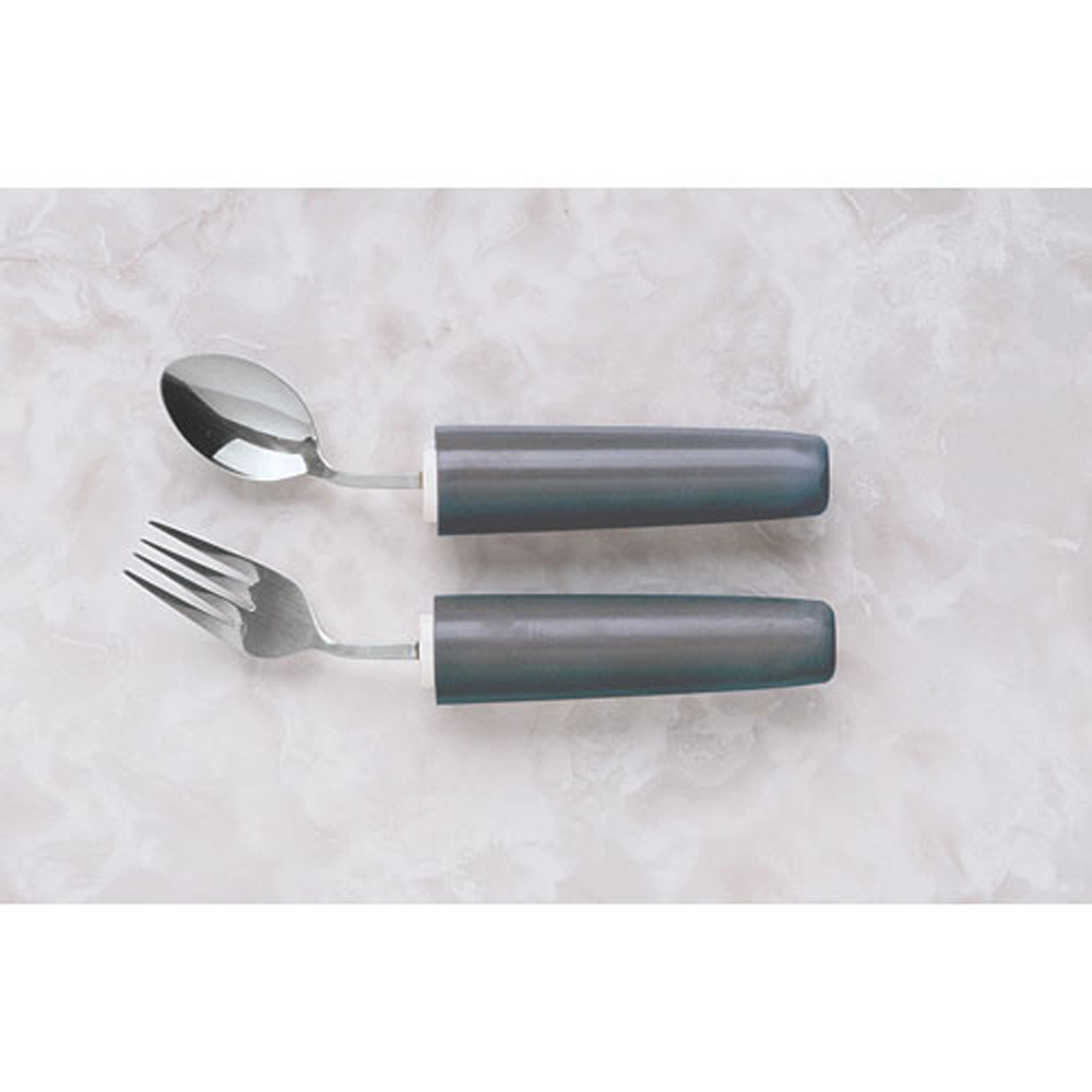 Angled utensils reduce wrist stress and provide easy use for people with limited upper extremity motion. Stainless steel utensils feature handles designed for hands with limited grasping ability. Lightweight, soft and contoured will not irritate pressure points. Handles have a soft, rubbery, non-slip surface.