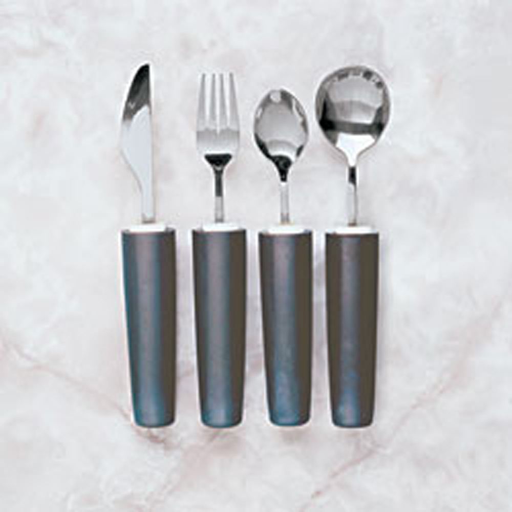 Stainless steel utensils feature handles designed for hands with limited grasping ability. Lightweight, soft and contoured will not irritate pressure points. Handles have a soft, rubbery, non-slip surface. Dishwasher safe.