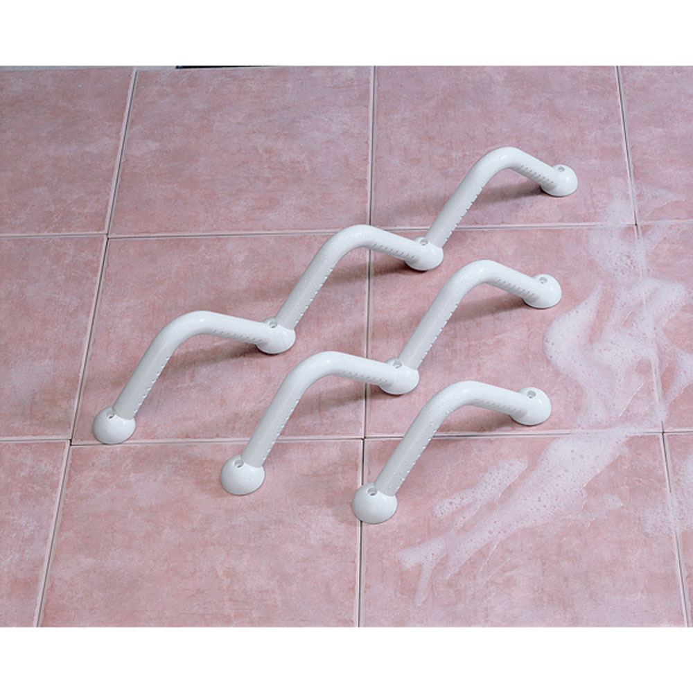 Ableware's Hand Grip is ergonomically designed to provide support and security in the bathroom while using the toilet, bathing, or showering. One or more bars can be installed vertically on bathtub walls or in shower stalls. The grip can also be installed vertically near toilets and commodes to aid in getting on and off a toilet seat. The plastic grips have grooved inner surfaces for a safe, non-slip grasp. The grip is suitable for home, institutional, or hotel use. It includes hardware and instructions for installation. The wall clearance is 3" (7.6 cm) and rod diameter is 3/4" (1.9 cm).