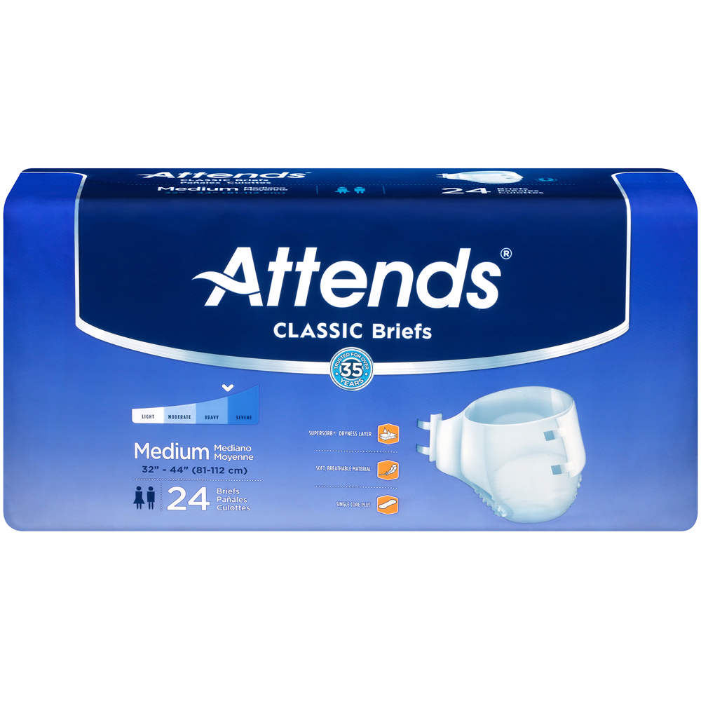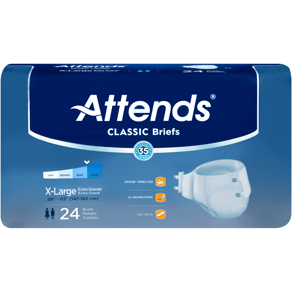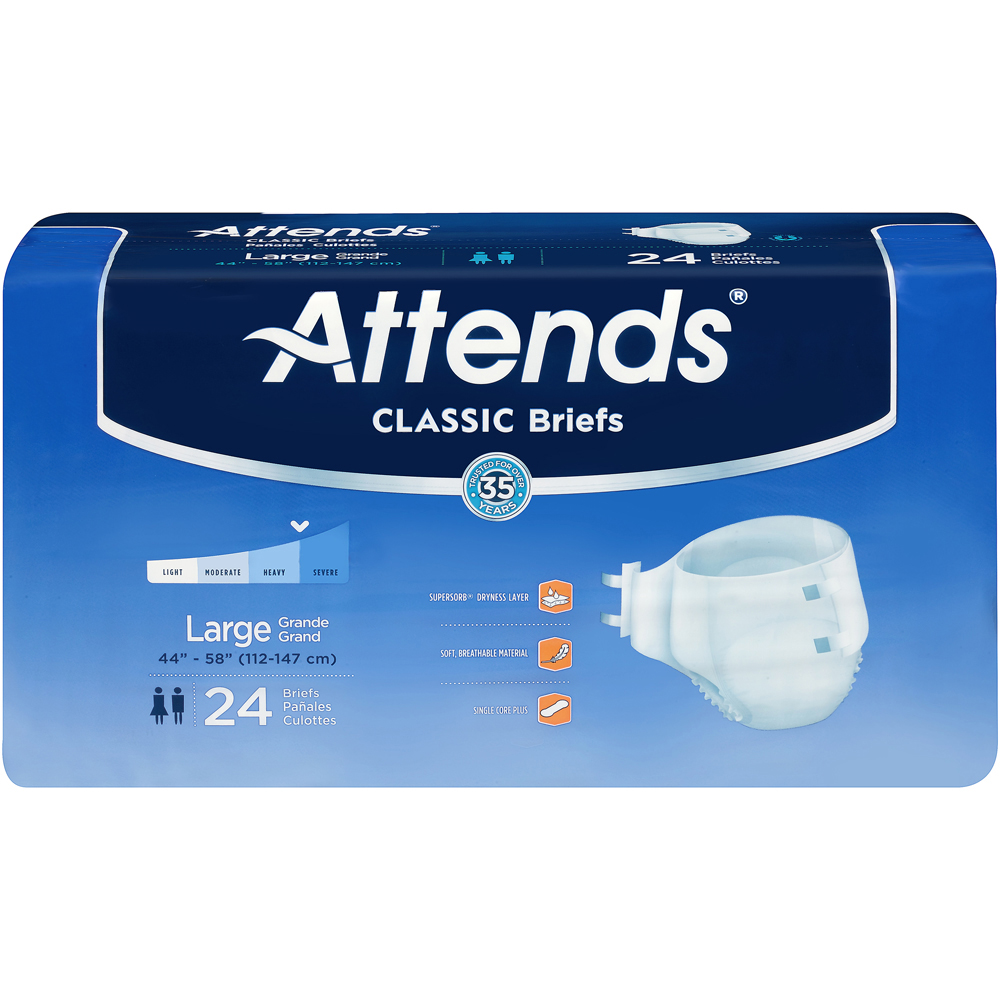 Regardless of the style you choose, Attends briefs are always designed for comfort and secure protection. All of our briefs contain super absorbent polymers to lock fluid in the core, as well as a moisture-proof layer and leg gathers to prevent leakage. They feature closures to hold them securely in place and a color indicator to signal when the brief needs to be changed. Attends briefs are packaged for easy identification of sizing by color.