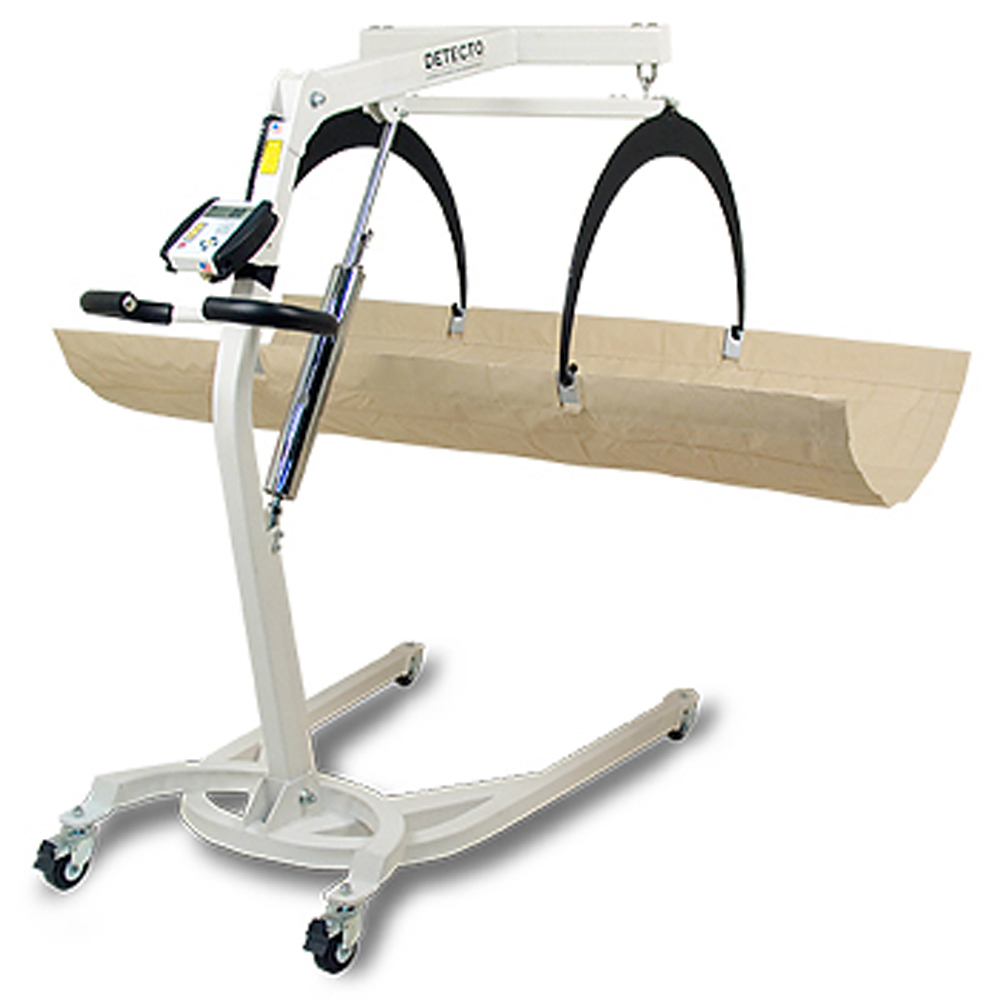 Designed for fast, accurate, and heavy-capacity patient weighing the IB800 scale features a flame retardant, antibacterial, self-deodorizing stretcher which is placed under the patient and hydraulically lifted inches from the bed. The touch of a button gives a digital readout of the patient's weight. The tare function lets you subtract the weight of bedding. One nurse can quickly gather data from an entire floor, without wasted motion or patient discomfort! Safety features include locking casters and lockable base widening stance for stability.