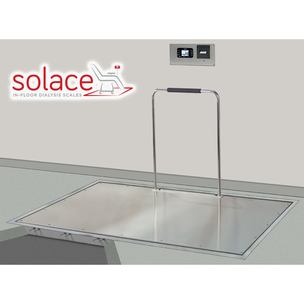Detecto's Solace series USA-made in-floor dialysis scales are flush-mounted platform scales that feature stainless steel decks and include a pit frame, trim ring, and interface cable to the included multi-color, touchscreen LCD indicator and printer. The flush surface eliminates tripping hazards and hallway accessibility issues. The Solace series is available with or without a handrail and all models include a recessed-mount indicator and ticket printer combination. These in-floor scales with high 1,000-lb x 0.2-lb/450-kg x 0.1-kg capacity easily accommodate patients with walkers, canes, wheelchairs, and dialysis chairs