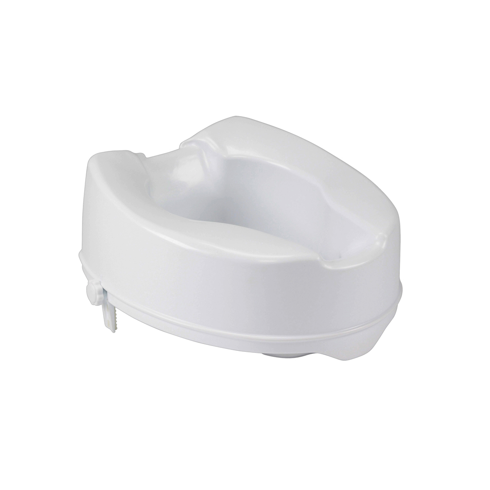 This raised white toilet seat by Drive Medical attaches tool-free to your existing standard toilet bowl. It is easily secured and features two rear locks that ensure the seat won't slip. A pair of hygiene cutouts provide maximum convenience during use. This dependable product is also as easy to clean as it is simple to use. The elevated seat will help individuals who need a boost sitting down or standing up from the toilet. For consumers using a wheelchair this product allows for easy transfer to and from the raised toilet seat.