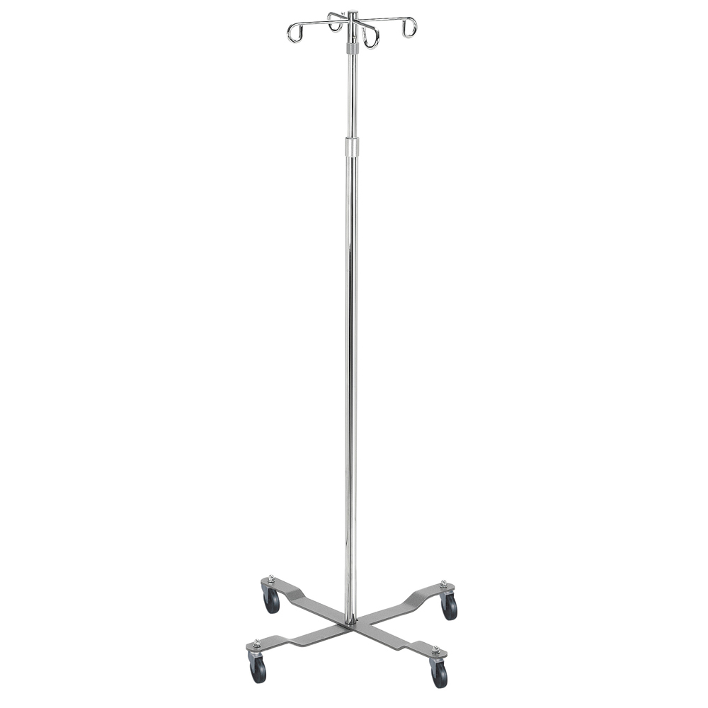 Removable hooks on this economy 2 hook IV pole (in chrome) by Drive Medical speak to its versatility. With easy push-pin release, it converts between a 2-hook and 4-hook top. (Product is available in 2-hook and 4-hook form.) Chrome-plated steel with weighted base provides strength and durability, while, most importantly, reducing the risk of tipping. A locking collar allows for simple height adjustment to the stem and four rubber wheels ensure smooth transportation and maneuverability.