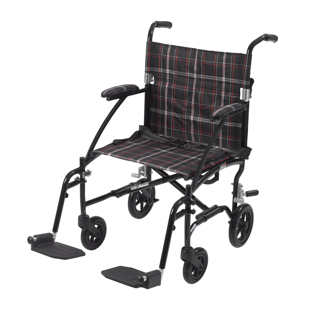 The 19" Fly Lite Ultra Lightweight Aluminum Transport Chair by Drive Medical, available in a variety of attractive colors, is an ultra light transport chair, weighing under 17 lbs without riggings. This transport chair comes with a stylish blue aluminum frame and blue plaid nylon upholstery. It is also durable and easy to clean. Comes standard with a carry pocket on the back rest to easily and securely transport personal items, seatbelt for added safety, and tool free, height adjustable swing away footrests. The deluxe back release allows the back to be folded down easily, making the chair easy to store and transport.