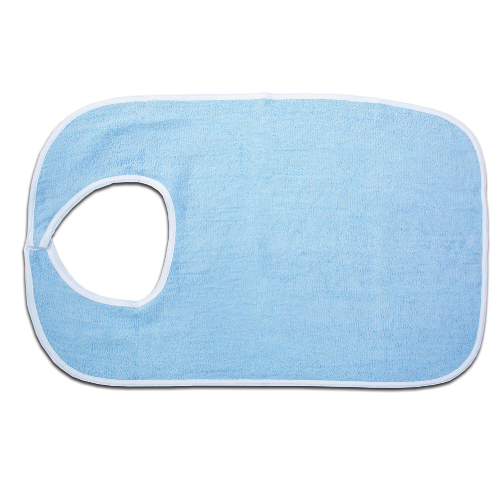 Soft blue terry cloth bib offers full protection for user while eating and drinking. Hook and loop closure allows for easy wear ability and confidence when in use. Bib is 18" x 30" and is washer/dryer safe.