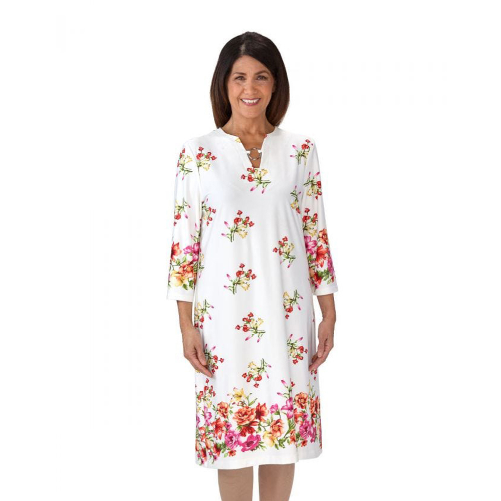 This 3/4 Sleeve Charming Floral Ring-Neck Open-Back Dress surrounds you in the beauty of flowers. This adaptive dress has a generous back overlap with two dome/snap closures at each shoulder for easy assisted dressing. Snap back dresses and back snap dressing solutions make dressing a breeze for both the individual being dressed and the caregiver assisting in the dressing.