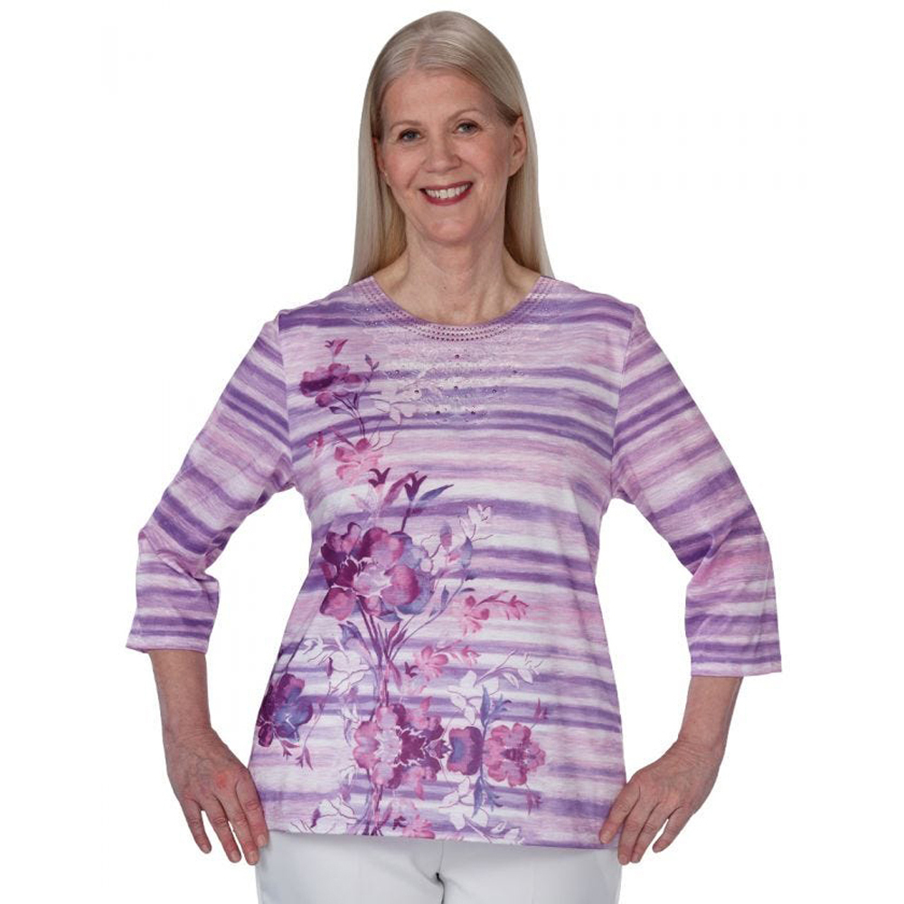 Lace-Trimmed Open-Back Top makes it easy for wheelchair-users to feel pretty. Crew neck 3/4 sleeve length top for women. Full back overlap with two snaps at each shoulder. This top completely opens up, allowing the individuals arms to be slid into the garment sleeves without ever having to raise/lower their arms or struggle with small neck openings. The back overlap is then folded over and domed/snapped into place.