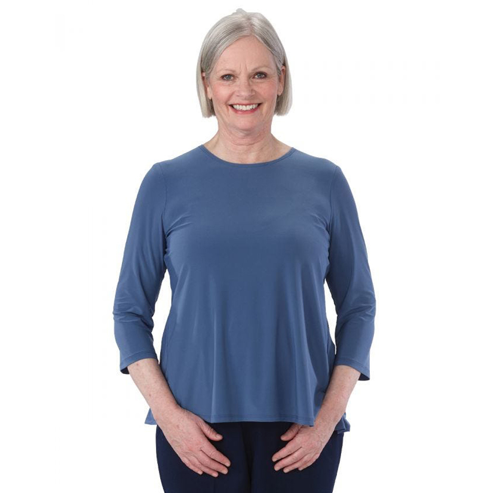 Beautiful Solid Color Open Back Top from Silvert's. This adaptive top features 3/4 long sleeve, scoop neck and side vents for an easy fit. Silvert's adaptive top completely opens up, allowing the individuals arms to be slid into the garment sleeves without ever having to raise/lower their arms or struggle with small neck openings. The back overlap is then folded over and snapped into place. The snaps are placed on the shoulders to avoid pressure points.