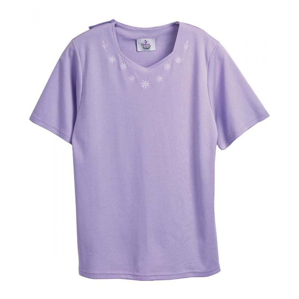 Summer Basics at Stock Up Prices Weve given this open-back summertime favourite an update with fresh embroidery around the diamond neck. Short sleeves length. So comfortable, affordable and caregiver-friendly, youll want to buy a few. Full back overlap with two snaps at each shoulder. This adaptive clothing for women adaptive tee shirt completely opens up, allowing the individuals arms to be slid into the garment sleeves without ever having to raise/lower their arms or struggle with small neck openings.