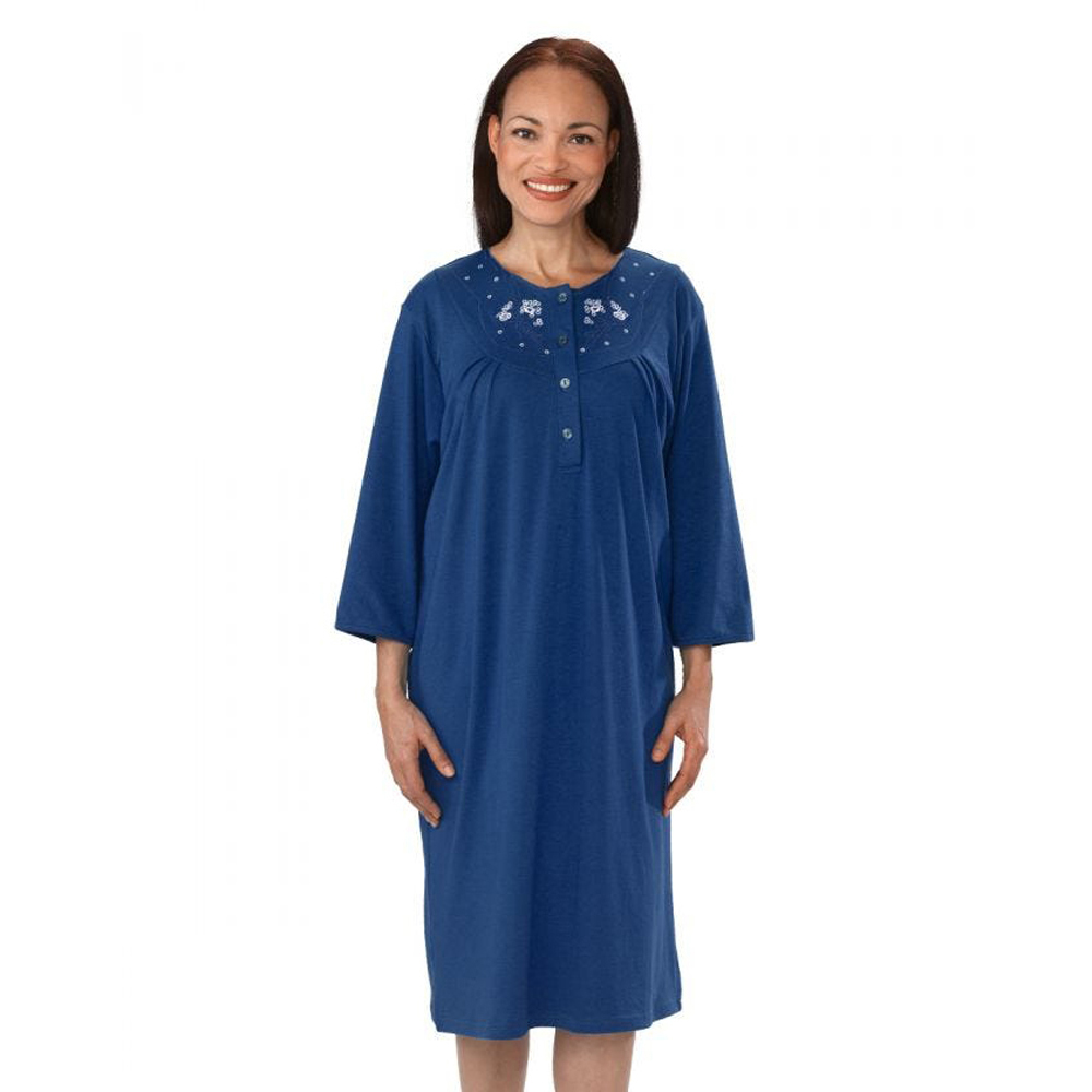 These Hospital Patient Gowns are Bedtime Beauties embellished with lovely embroidery and four functional buttons. The gathered yoke and ¾-length sleeves make it very comfortable. Full back overlap with two snaps at each shoulder. The full back overlap provides complete comfort and discretion unlike traditional tie back hospital nightgowns. The dome/snap closures are placed on the shoulders to avoid any pressure points. Comfortable raglan sleeves.
