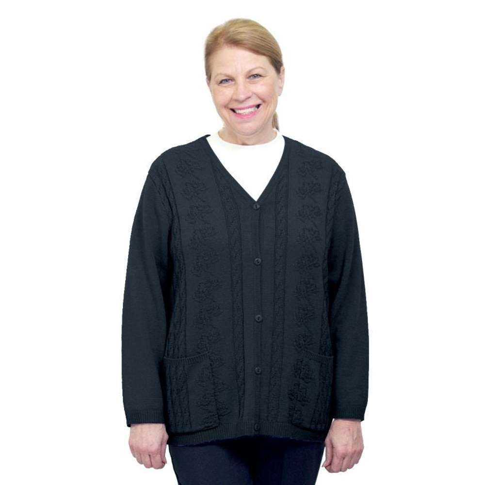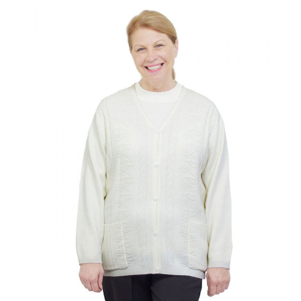Adaptive Clothing Open Back Cardigan Sweaters in a warm winter weight are perfectly designed for those you care for. Wonderfully soft machine washable acrylic knit embellished with pretty pointelle stitching. (100% Acrylic) Decorative front buttons. Two patch pockets. Back overlap with two domes at each shoulder.