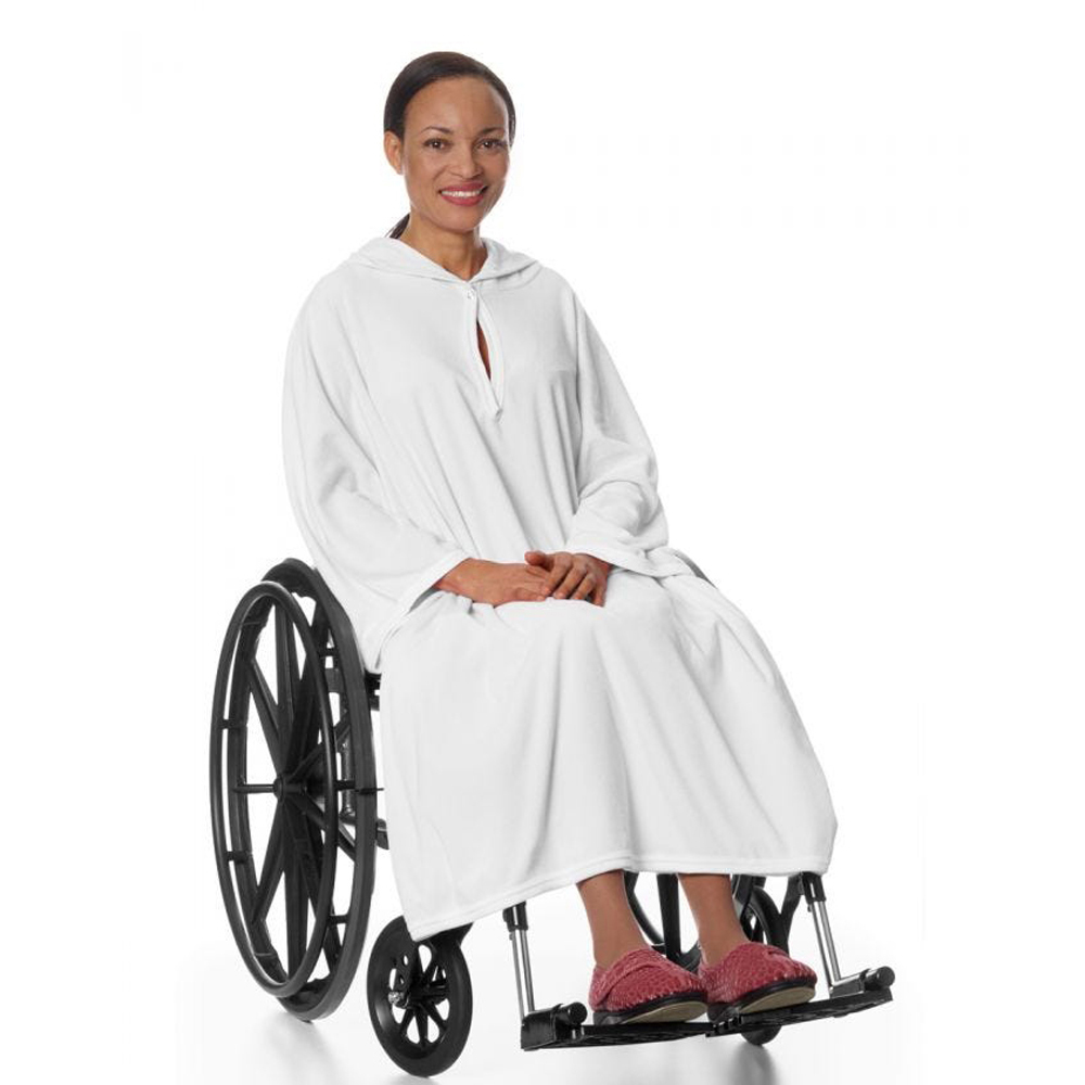 Plush Terry Shower Capes are a must-have for after-bath warmth and discretion. Long back for full coverage. Snap closure at neck. Quality machine washable 80% Polyester-20% Cotton Terry. Easy to use dome closures down the sides make it easy to slip on. It's even hooded for extra warmth! Convenience never felt so cozy. This adaptive shower cape robe and bath robe by Silvert is terrific for elderly/seniors who are disabled or for wheelchair dependent adults. Great choice for nursing homes accessories.
