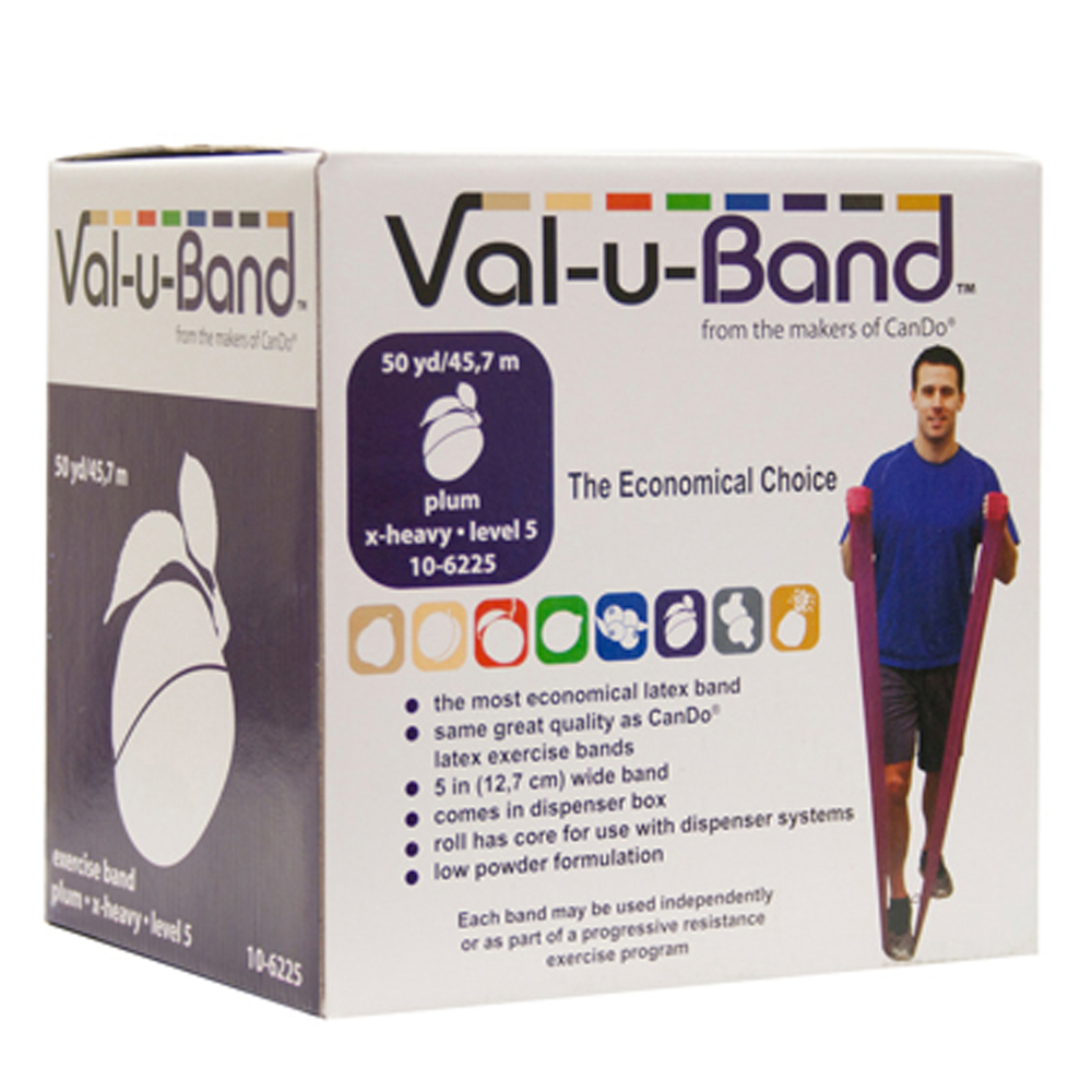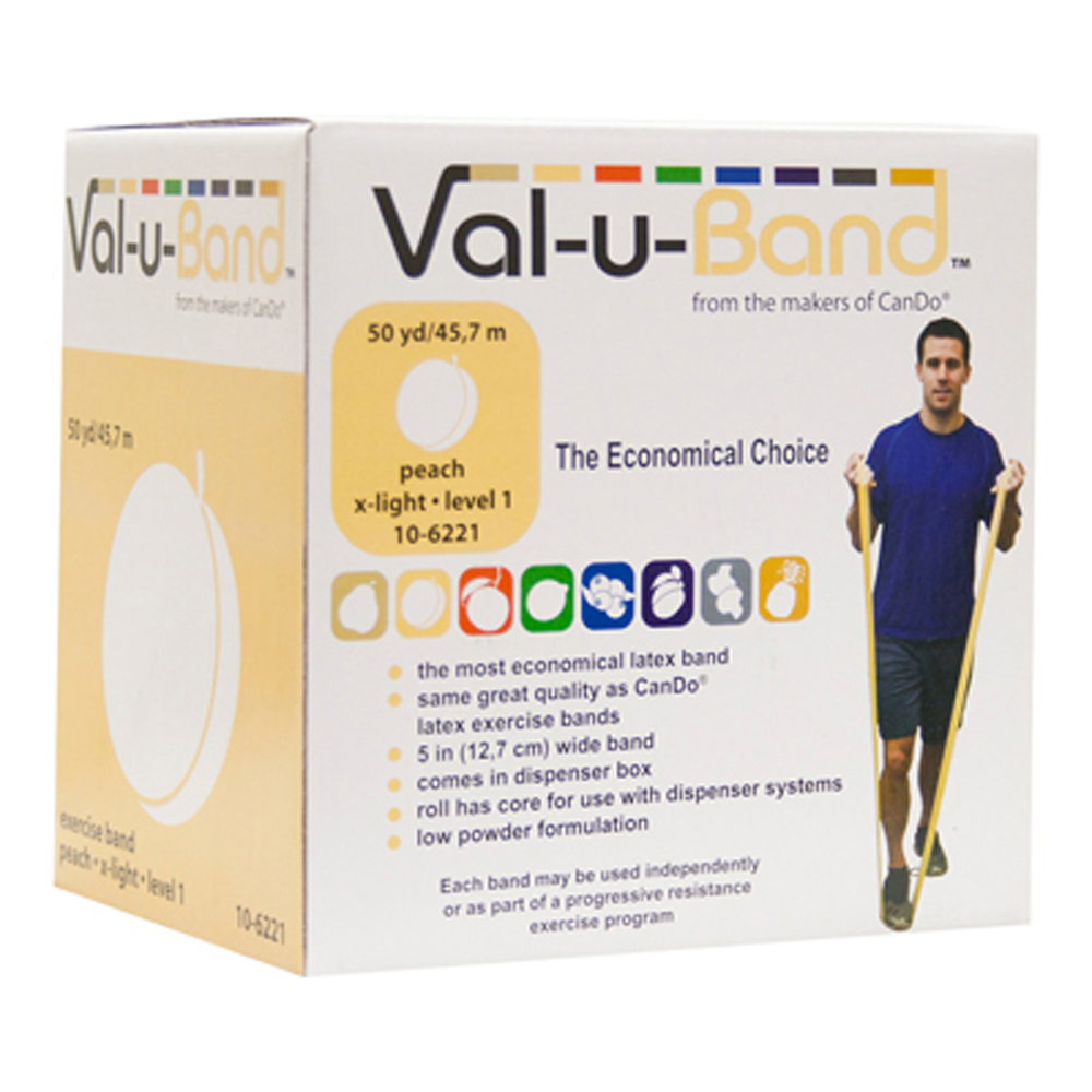 Low powder resistive exercise Val-u-Band is color-coded in Berry colors. Low powder Val-u-Band is an economical latex exercise band; same great quality as CanDo latex exercise bands; 5" width band available in dispenser boxes; Available in 6 and 50 yard roll; 50 yard roll has core for use with dispenser systems. Levels range in order of resistance from least to greatest resistance: pear (0), peach (1), orange (2), lime (3), blueberry (4), plum (5), mushroom (6), pineapple (7). For those with latex sensitivities, there are latex-free alternative offerings of Val-U exercise band. 50 yard - pear (level 0/7)